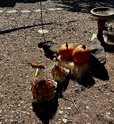 Maybelle is my first yard goose and remains the unofficial “queen of the front yard.” I picked her name because it seemed cheerful and a little vintage, perfectly fitting her personality. Next spring and summer, Maybelle will rock a floral dress and an enormous straw sun hat to make her look ready to plant tomatoes or hand out lemonade. I look forward to finding and ordering more dress-up outfits for my geese in the coming months. Her signature fall look will give our front yard a welcoming, happy vibe that should catch the eye of anyone passing by. and our walking neighbors.