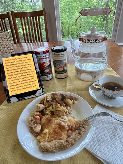I typically use a culp and saucer from my mom’s Japanese china, and I have my new Colorsoft Kindle set up with a book to read while I enjoy my tea. Today’s book was “Parting the Wasthington Sea” by James O’Brien.
